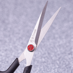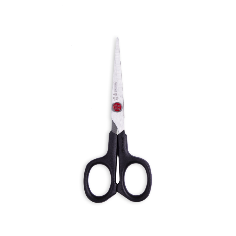 O modelo 653-5 possui fio laser para aparar pontas e cortes retos ou simétricos, com uma lâmina micro-serrilhada e outra lisa polida, além de um cabo plástico resistente.